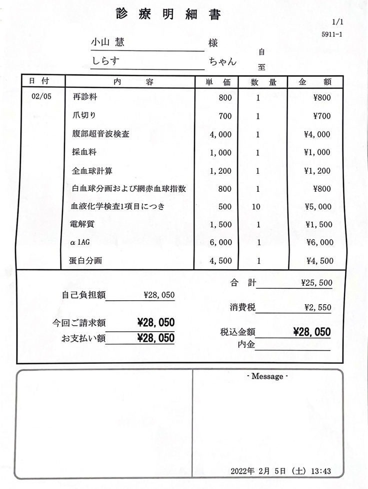 診療明細書です。※本日爪切りをしてもらったのでいつもと金額違いますが、治療にかかった合計金額には含みませんのでよろしくお願い致します!ですので、プラスさせる金額は¥27,350になります。