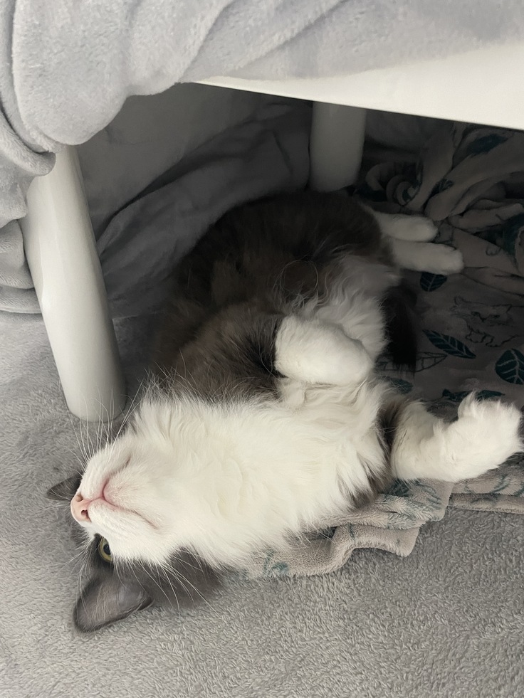 色々と寝る場所を転々としています。こたつの中にブランケットを入れていたら中で眠っていました!こちらは発見した時のお写真です!