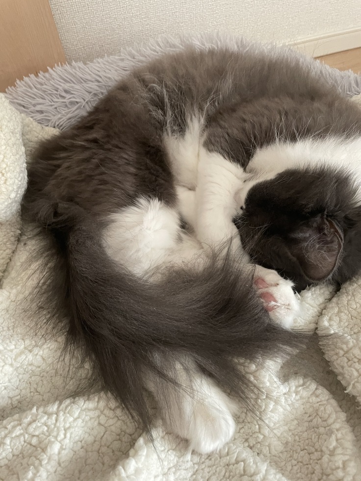 投薬を終え、66日が経ちました!寝ているしらすはいつも気持ちよさそうです。いつも通り朝にバタバタと騒いで昼、夜は休息という生活リズムのようです。おそらく夜中も起きて遊んでいると思います!完全に夜型の子です…。