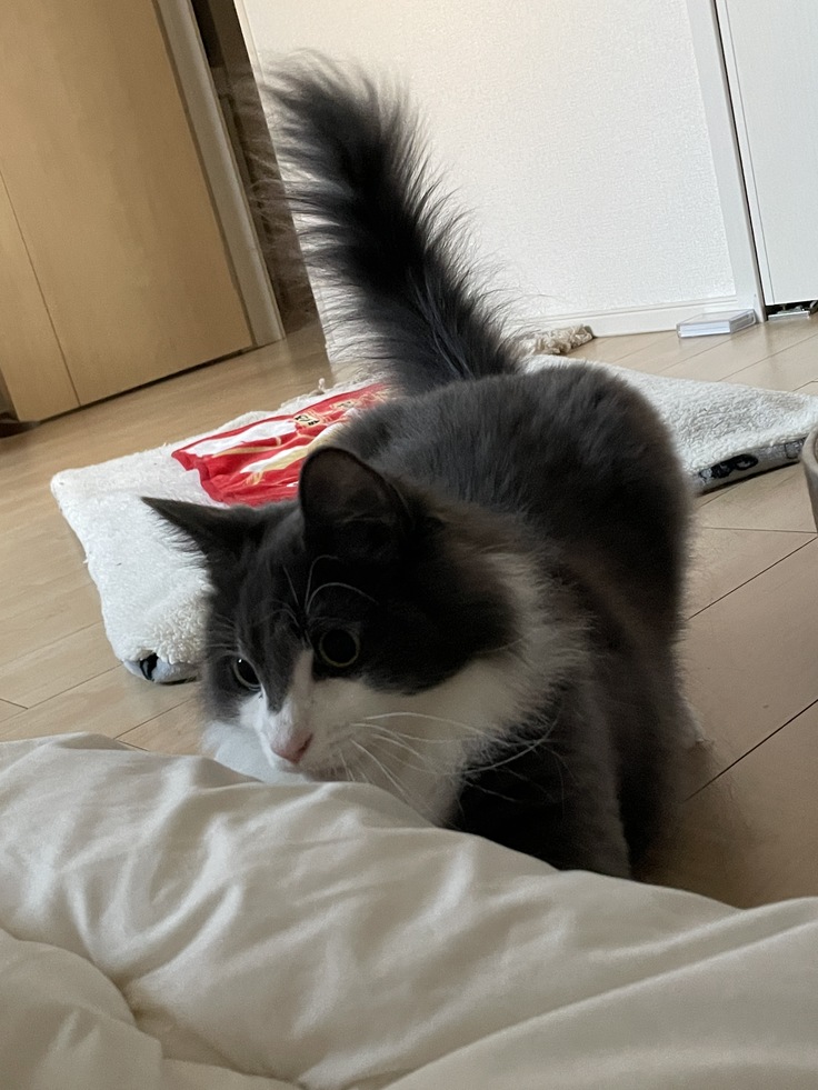 こんばんは!本日、最後の検査に行って参りました!こちら帰宅後のしらすくんです🐟しっぽがピーンとなって遊んでいます😊