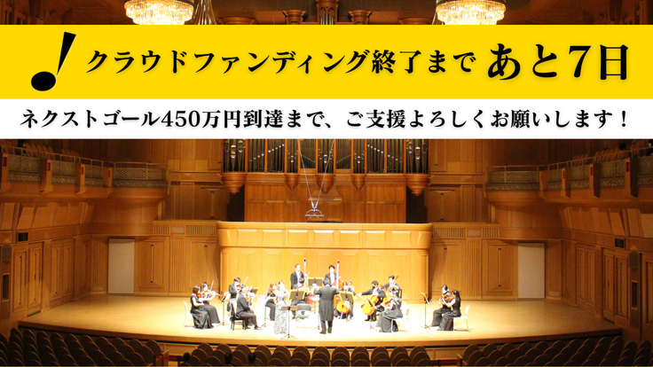 「シンフォニエッタ静岡|スプリンクラー事故から3年、優れた作品を繋ぐ」が募集終了まで残り7日となりました。みなさまからのあたたかいご支援のおかげですでに第一目標である300万円については到達しておりますが、ネクストゴール450万円を目指し、引き続きご支援を募集しております。既にご支援を頂きました皆様におかれましては、拡散にもご協力いただけますと幸いです。
