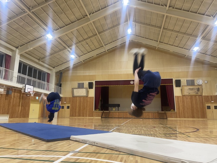 練習環境は整っているとは言えず、競技に必要不可欠なマットも使用期間およそ10年のハーフマット数本。フルマットにすると2本分あるだけです。※大会ではフルマット9本で演技します