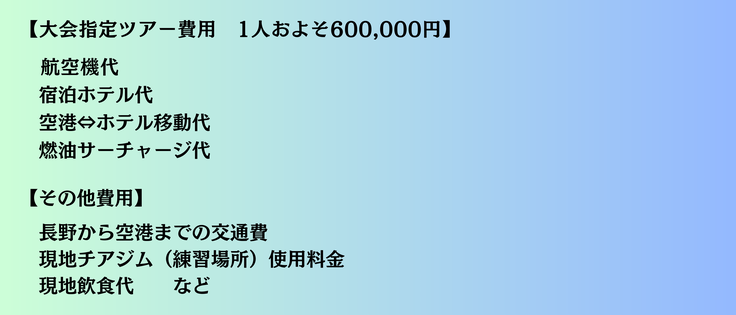 数年前の世界大会平均費用は、1人30~40万円。各家庭が、その覚悟をもって大会に挑みましたが、物価の高騰や円安の影響で、渡航費が跳ね上がり、1人あたり60万円以上に。出場選手、監督、コーチの計20名で総額1,200万円です。