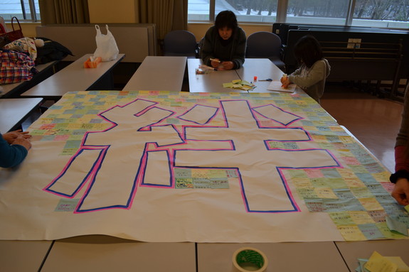 保護者は、こどもたちが練習をしている間、色んなイベントを見に来てくれた方に書いていただいた東北の方への応援メッセージを貼り合わせたメッセージボードを作りました。