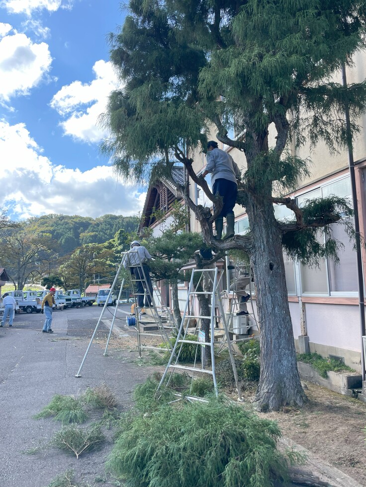 草刈りは、自治会さんも年2回を計画していただいてますが、大きく広がった樹木の剪定は、敬老の皆さんのお得意なところで、建物正面にある金木犀や黒松がサッパリ、ツツジの植え込みもきれいに形を整え剪定いただいてスッキリ