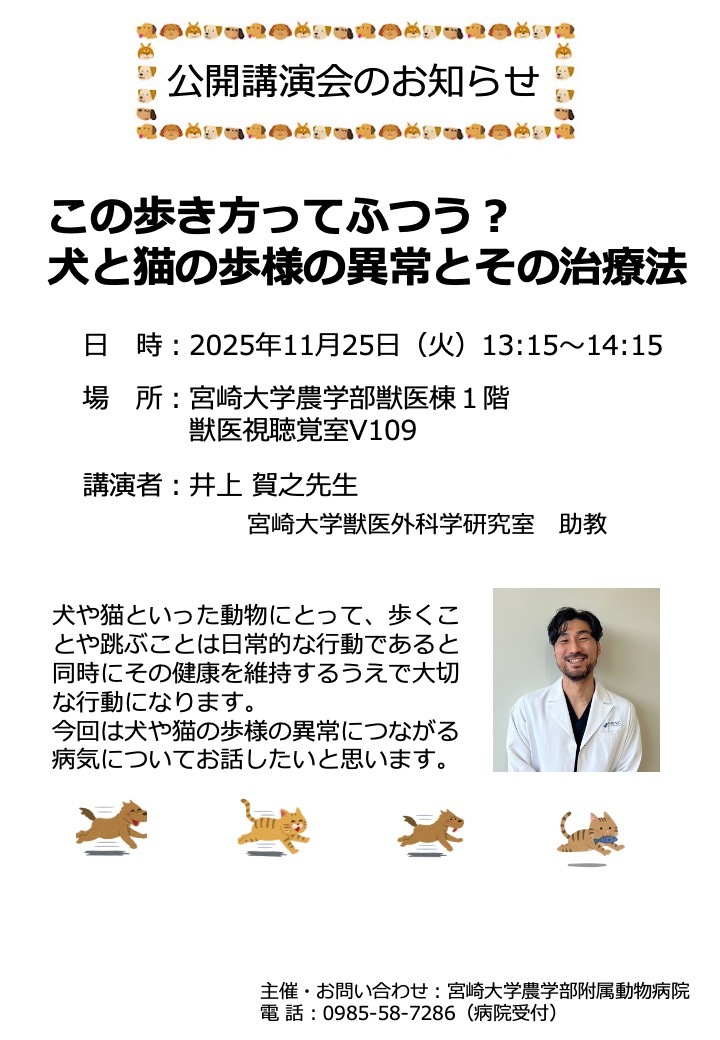 2025年11月25日13時15分より本学農学部獣医棟1階、獣医視聴覚室(V109)にて、「この歩き方ってふつう?犬と猫の歩様の異常とその治療法」をテーマに公開講演会を実施させていただきます。