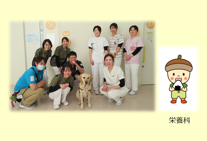 管理栄養士とアイビーがふれあう機会はないのですが、病室で子供たちとふれあっている様子や検査、手術に付きそう場面を見かけることがあります。そんな時は思わず「アイビー~♡」と声をかけてしまいます。私たち管理栄養士もアイビーと同様、患者さんに寄り添い、1日も早く元気になるようサポートしていきたいと思います。