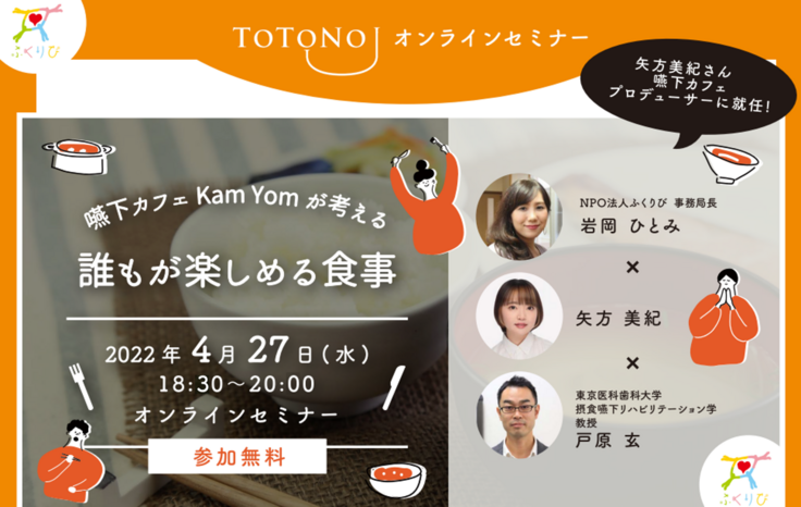 明日4月27日(水)18:30より、『嚥下食カフェKam Yomが考える「誰もが楽しめる食事」』と題したオンラインセミナーを開催いたします!