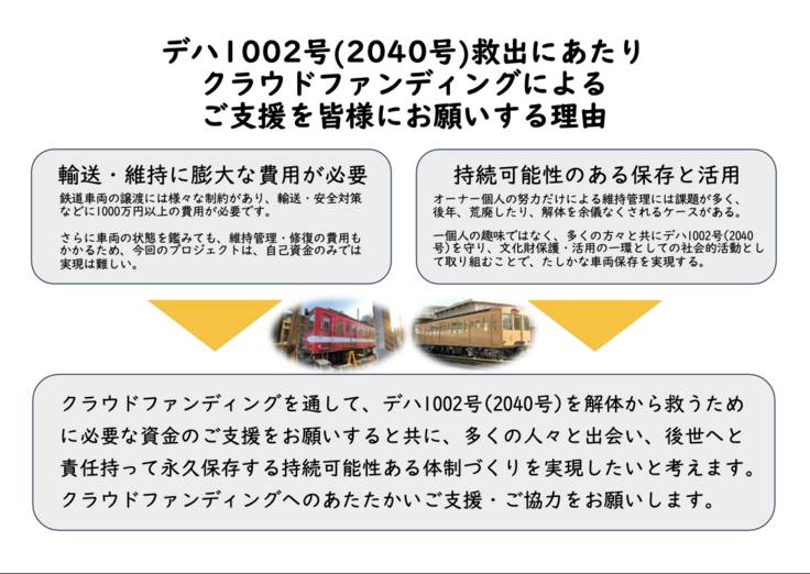 このような背景のもと、今回のプロジェクトでは、ご批判を受けることも覚悟の上で、クラウドファンディングによるご支援をお願いし、デハ1002号(2040号)の維持管理の持続可能性をより確かなものにしなければならないと考えました。