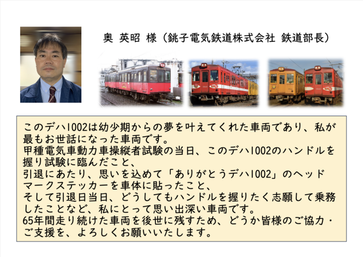 『夢を叶えてくれたデハ1002』 (銚子電気鉄道 鉄道部長 奥様よりラストスパートの応援メッセージ)
