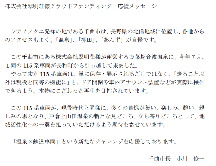 千曲市の市長、小川修一様より応援メッセージを頂きました!
