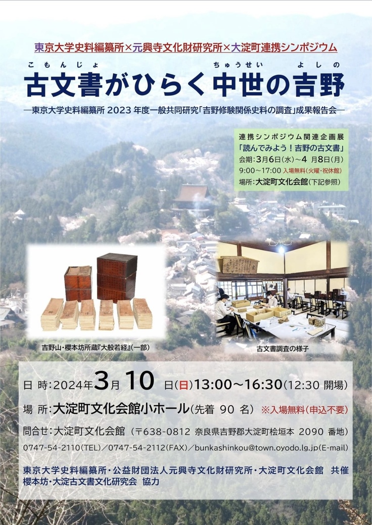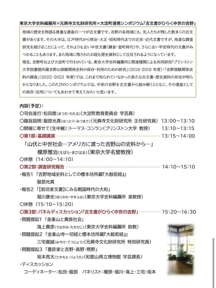 現在、吉野地域で行われている、中世の吉野に関する古文書・歴史資料の調査研究成果を報告します(入場無料です)。興味のある方、ふるってご参加下さい。関連企画展も予定されています。