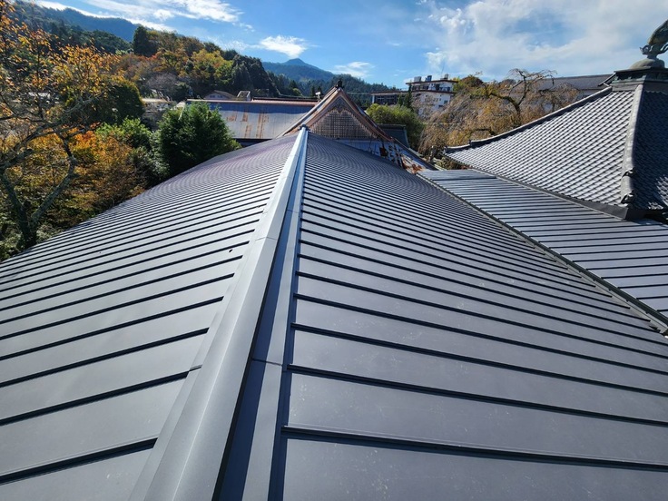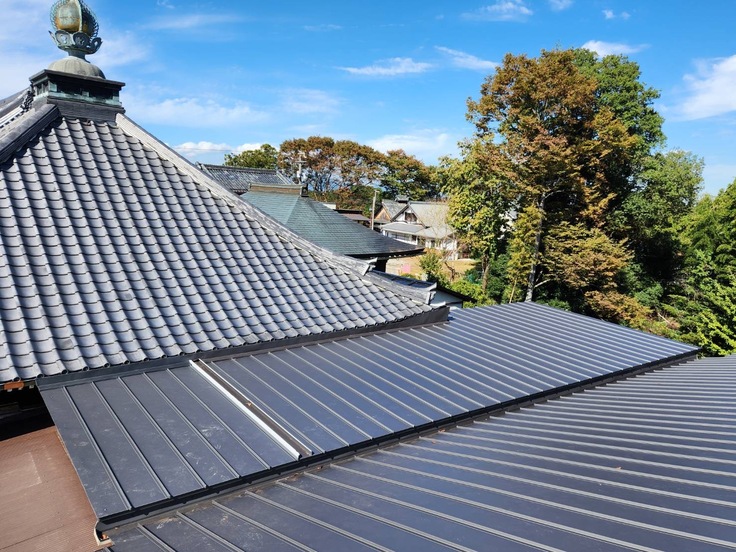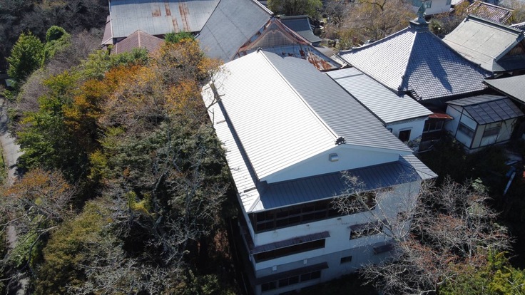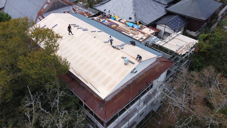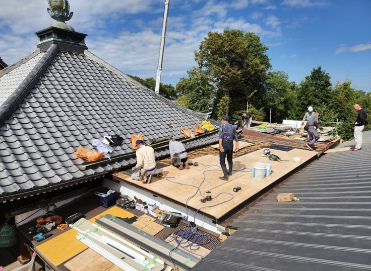 結果、沢山の皆様方のあたたかいお力添えを頂き、また工事現場監督・大工さん達のおかげもあり、大講堂屋根(外装)の修繕が完成致しましたことを、ご報告致します。