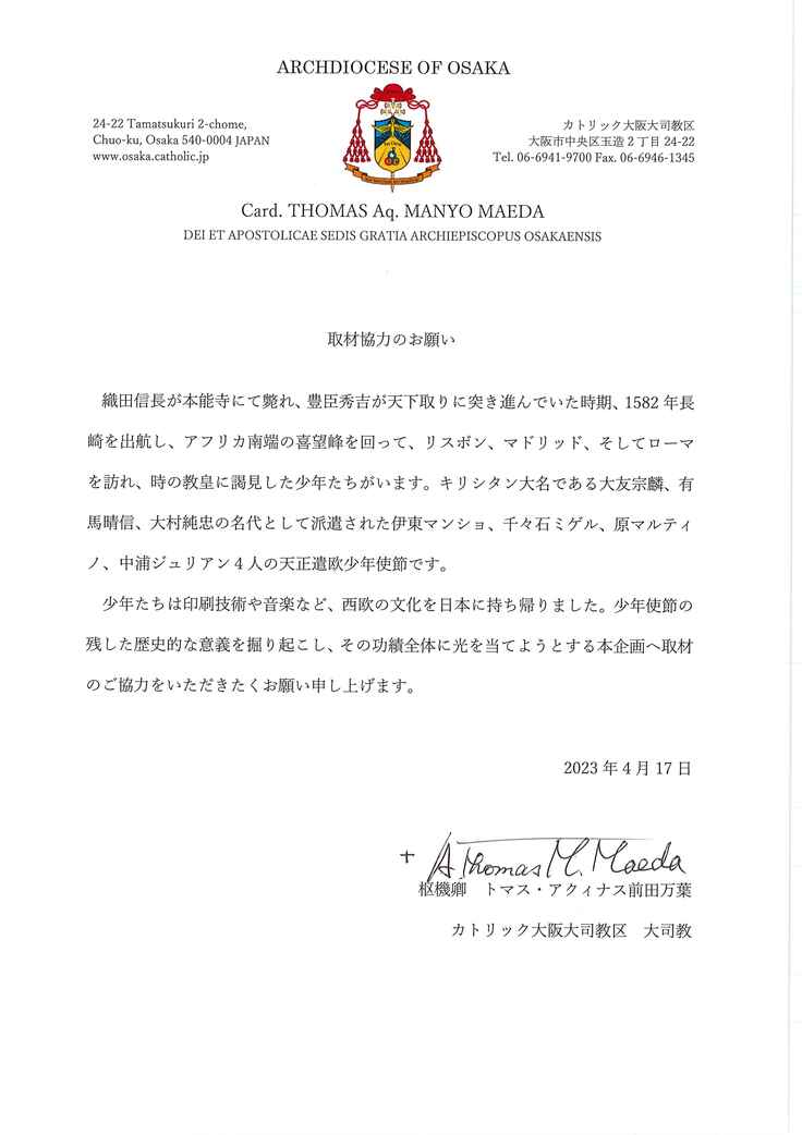 カトリック教会枢機卿・前田万葉大司教様の取材協力依頼書です。