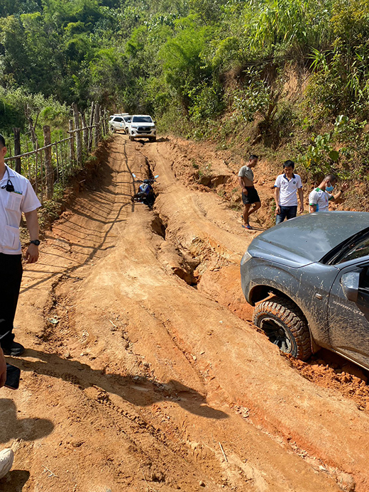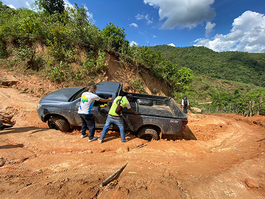 電気や水道もない山地集落では、幹線道路を外れると道路も舗装されていないため、乾季に入ったものの雨季でぬかるんだ道路が、そのままの形で乾燥し車での移動が非常に困難になります。