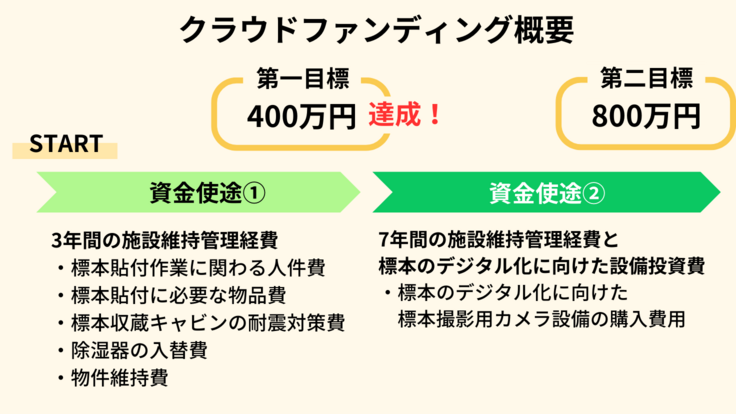 第一目標の達成により、老朽化した除湿機の交換や、標本を収蔵しているキャビンの耐震対策などを施すことができるようになり、既存の標本を維持するための最低限の設備投資が可能となりました。また、これにより3年間の標本庫維持管理にかかる経費の目途がつきましたので、ひとまずは標本庫存続の危機的な状況を脱することができました。