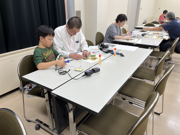 野外で植物採集の実演の後,当園の教員が採集した植物の貼り付け体験を行いました.最初は少し恐る恐るでしたが,皆さんコツを掴むのが早く,やがてそれぞれが気に入った植物を選んで次々と貼り付けていました.