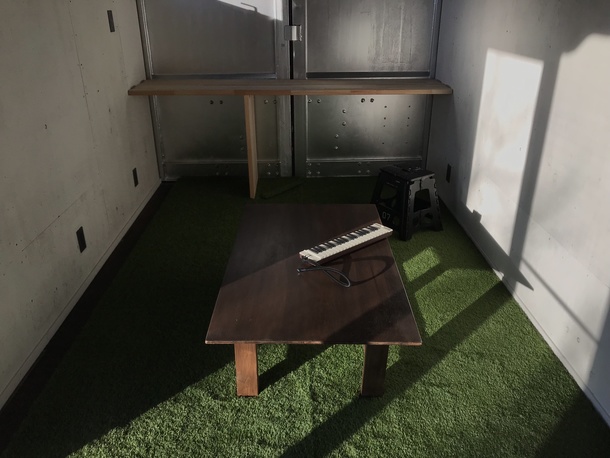 先ほどのローテーブル(大)を入れたところです。脚と天板はネジで取り付けてあるだけですので、取り外して片付けるのも簡単です。夕方の時間帯は、こんな感じで夕日が入ってきます。そしてテーブルの上の「大人のピアニカ」、ここで吹くといい音がします!楽器の練習したい方、爆音でなければぜひご活用ください!