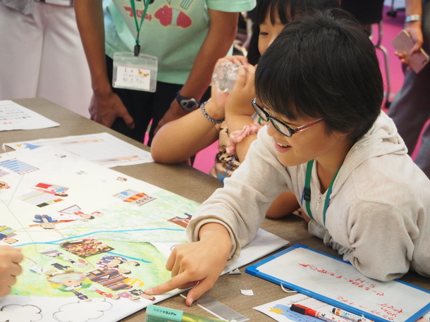 株式会社セールスフォース・ドットコムの本社へ赴き、社員の方と一緒にプログラミング体験。架空の「つぼみ町」に発生した問題を様々な仕事の力で解決していくワークを行います。このワークを通じ、様々な職業のつながりで「まち」が成立しているということを子どもたちに実感してもらいました。