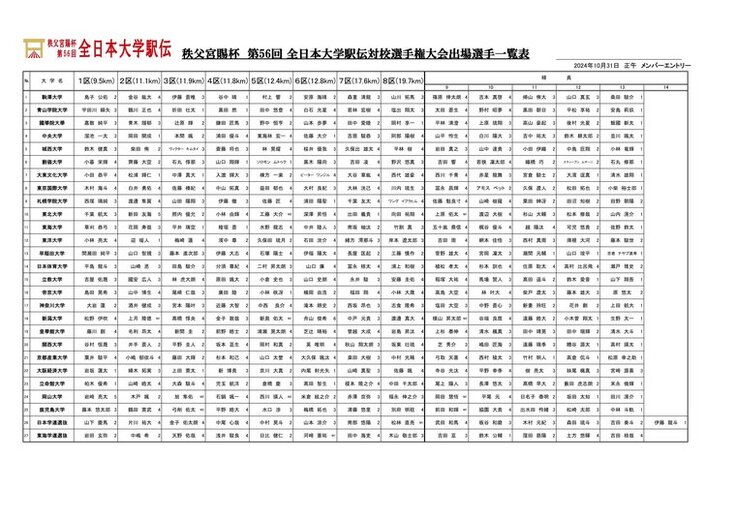 1) 大会名:第56回全日本大学駅伝(熱田神宮~伊勢神宮 8区間109.8km)