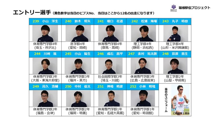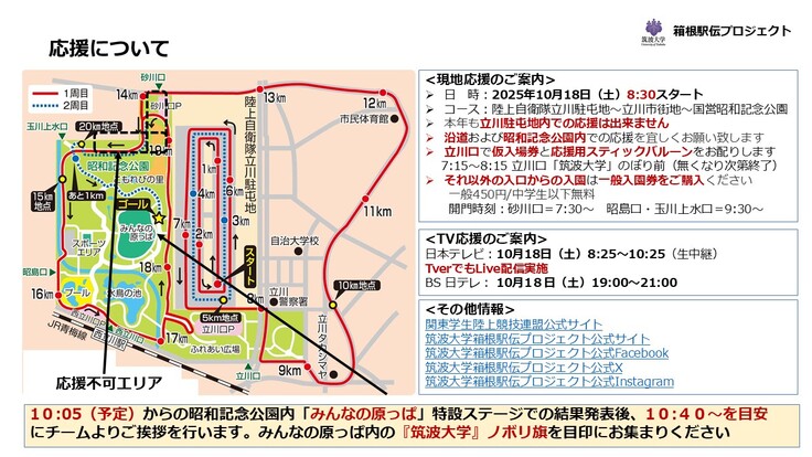 本年はエントリー14名中、7名が予選会初挑戦のチームであり、皆様のご声援が大きな力になると思います。残念ながら、本年もスタート地点の陸上自衛隊立川駐屯地内は観戦禁止区域となってしまいますが、是非とも立川市街地沿道および昭和記念公園内でのご声援、またテレビ画面を通してのご声援をお願いいたしたく、「応援のしおり」を作成致しましたのでご活用いただけたらと思います。