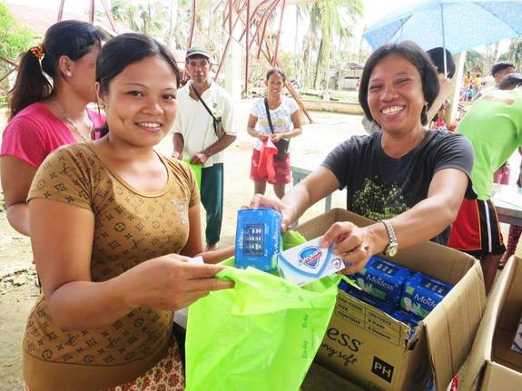 (マニラ事務所ボランティアの学生と被災者 物資提供の様子)
