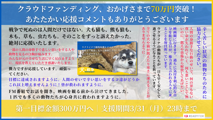 先週からスタートした『ウクライナ侵攻から3年――。いまだ続く戦地の犬猫救援活動にご支援を』プロジェクトですが、おかげさまで第一目標の20%を超え、70万円を突破いたしました!