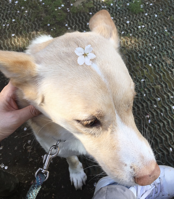 (写真はさくらの花びらを載せた愛犬ハルでございます)