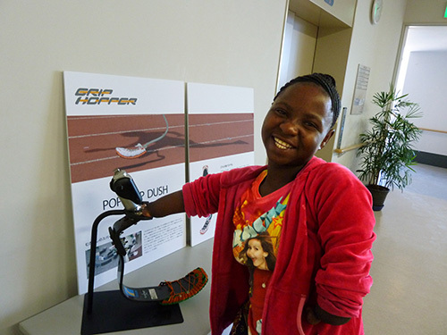 金属がむき出しでも、美しく装飾されているもの。特殊なシリコン素材で本当の足のような仕上がりのもの。間接が曲がって、訓練を積めば普通に歩くことができるもの。チーターの後ろ足のようなカタチのバネ板で、速く走ることができるもの。ソーシャルワーカーさんの説明を聞きながら、興味津々、関心しきり。