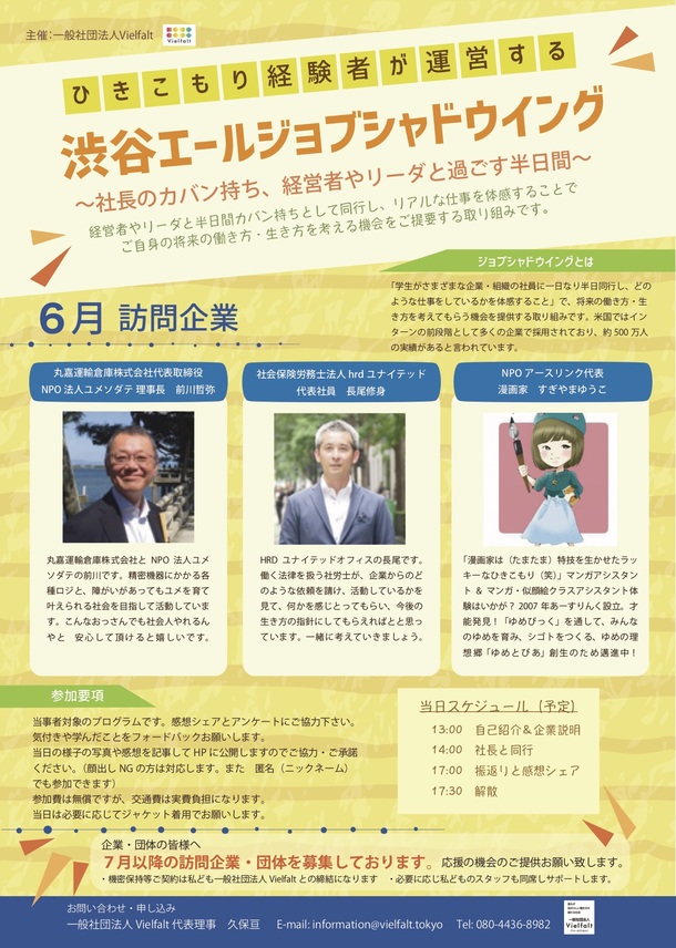 6月より渋谷エールジョブシャドウイング〜社長のカバン持ち、経営者やリーダと過ごす半日間〜」を実施しています。