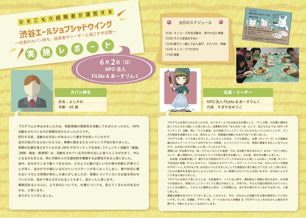 よしかわ(仮名)さん42 歳男性がNPO 法人 FILMe & あーすりんく 代表 すぎやまゆうこさんのカバン持ちを実施しました。