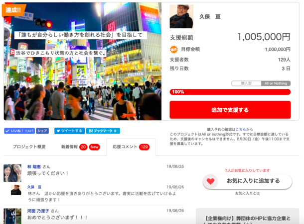 今日現在合計129名の応援を頂き、現在100万円以上のご支援が集まりました。