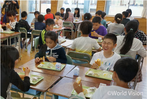 このため、私たちワールド・ビジョン・ジャパンはセーブ・ザ・チルドレン・ジャパンと連携し、ともに子どもを支援する団体として、子どもたちに少しでも栄養価の高い食事を届け、給食を楽しみにしてもらえるよう、給食に予定されていたパンと牛乳に加えて、チーズやゼリー等の補助食品3品を加える支援を実施しました。6月からは、より栄養価の高い「弁当給食」を支援し、保護者の負担を軽くします。