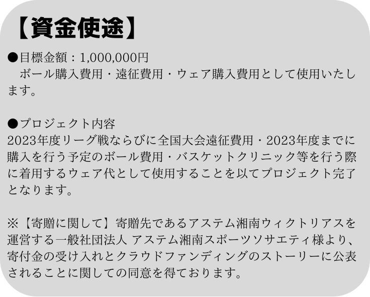 2023年度リーグ戦ならびに全国大会遠征費用・2023年度までに購入を行う予定のボール費用・バスケットクリニック等を行う際に着用するウェア代として使用します。