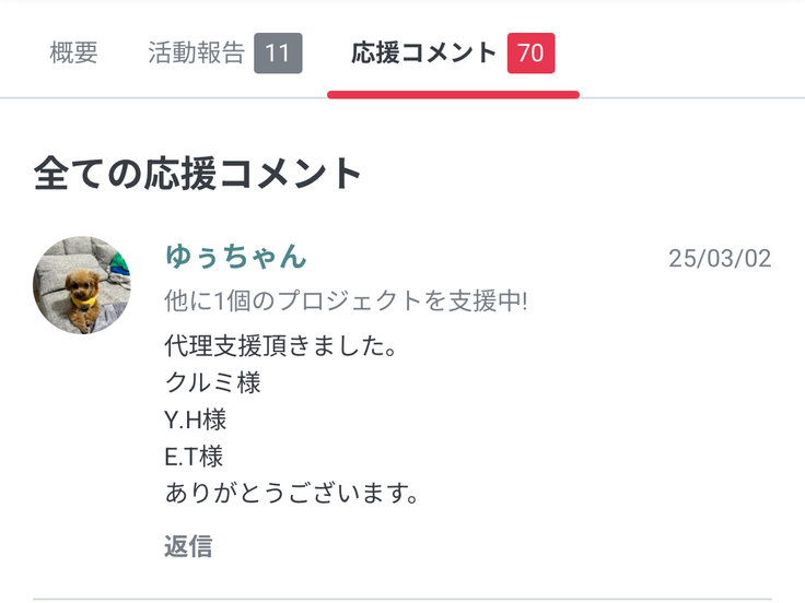 何もリターンできず申し訳ありません。頂いた支援金はゆずの手術や通院に大切に使わせて頂きます。ご支援に感謝します。