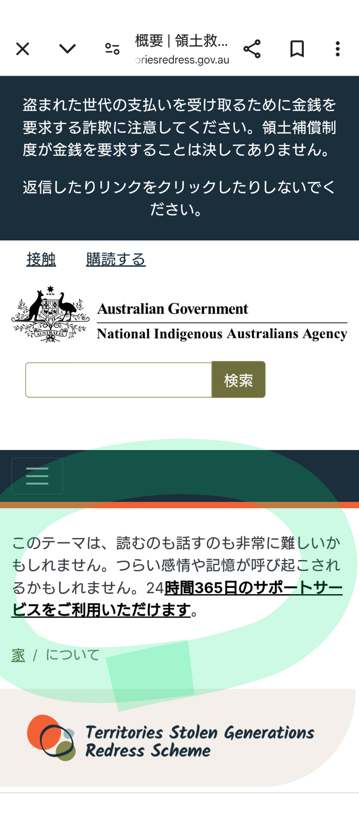 親から引き離されたアボリジナル子どもたちが収容された施設のひとつ「キンセラボーイズハウス」の歴史がアニメで紹介されました。8歳で収容されたウィリーさん(73才)は名前ではなく「36」という番号で呼ばれたそうです。補償制度の紹介ブースにて担当部局の方に質問したところ「まだまだ、歴史の教育は整っていません。教えてこなかった時代が長すぎました。オーストラリアの恥ずべき歴史です。」と教えてくれました。また、補償制度を案内するホームページには、出来事への対峙により生まれるであろう衝撃に対して24時間365日の心理的サポートが受けられる記載がありました。