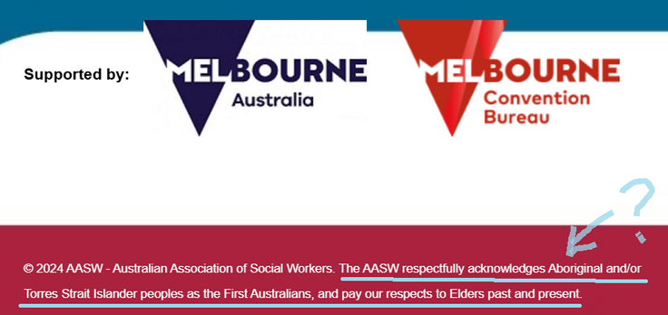 ↑下線部の意訳「AASWは、アボリジニおよび/またはトレス海峡諸島民を最初のオーストラリア人として敬意を表し、過去と現在の長老たちに敬意を表します。」
