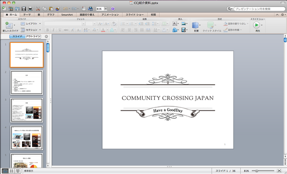 この大切なホームページに加えて、CCJに関するプレゼンテーション資料テンプレートやパンフレットはデザイナーの木村によるデザインが生かされています。