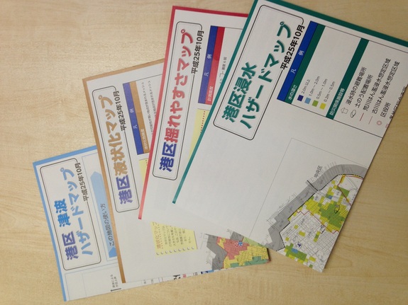 先日私の事務所に港区からハザードマップが送られてきました。「津波ハザードマップ」「浸水ハザードマップ」「液状化ハザードマップ」「揺れやすさマップ」の4種類。