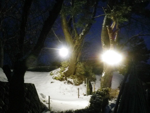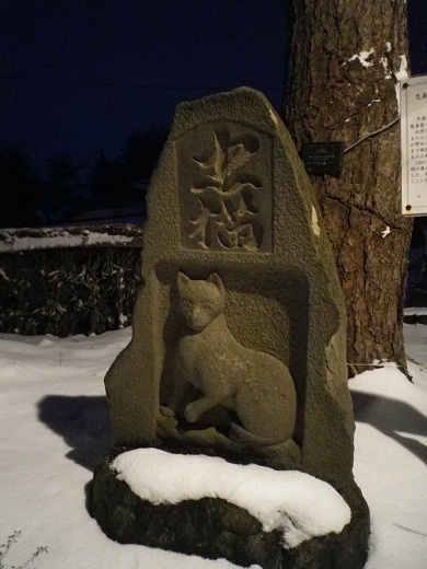 添付写真ですが、冬にお参りをされる方のために、当会の会員が猫碑までの通路の除雪と照明を設置した時の様子です。大変な労力が要ります。皆がお参りしやすい環境にするため、猫ちゃんをここから脱出させ、神社にお祀りしてあげたいのです。宜しくお願いいたします。雪の下では可哀想です。