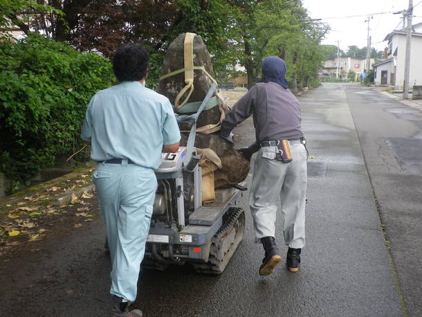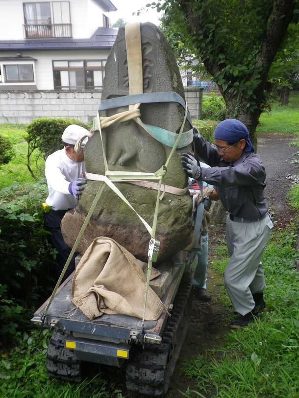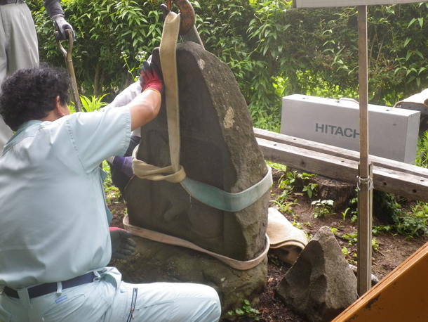 猫碑を吊り上げ用のベルトに固定しているところです。