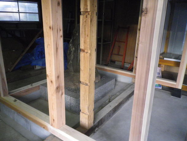 束石(黒御影石)を設置、その上に柱が立ちました。