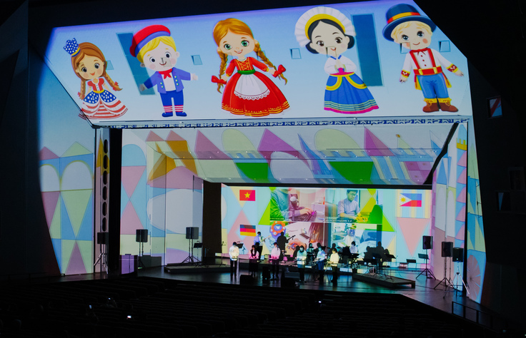 また演奏に合わせたプロジェクションマッピングでは2羽の鳥が登場しました。最初は赤と青の鳥2羽が対立している描写から、お互いを尊重し和解したことで2羽の白い鳥となって未来に羽ばたいていくという壮大な演出を行いました。