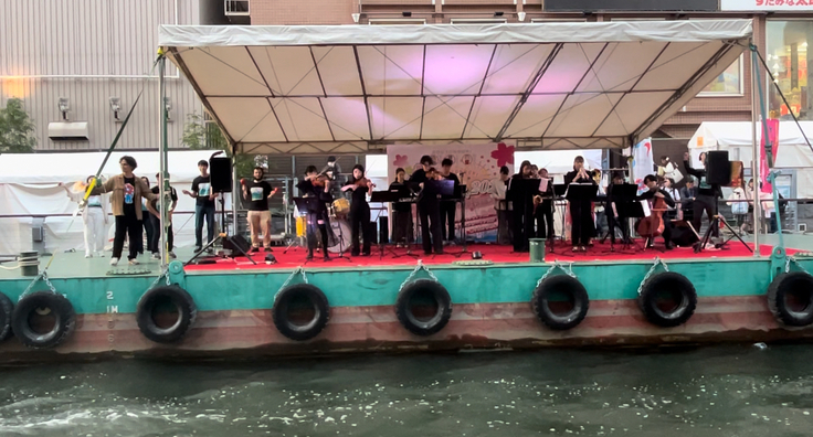 川の上に浮かぶ特設ステージにて、a-tuneは昨日のプログラムのトリを飾らせていただきました!大阪・関西万博のテーマソングであるコブクロの「この地球(ほし)の続きを」やa-tuneのオリジナル楽曲「Uni-Tunes」のほか、関西学院大学交響楽団の方をお招きし、生楽器と合わせて「銀河鉄道999」と「情熱大陸」も演奏しました。