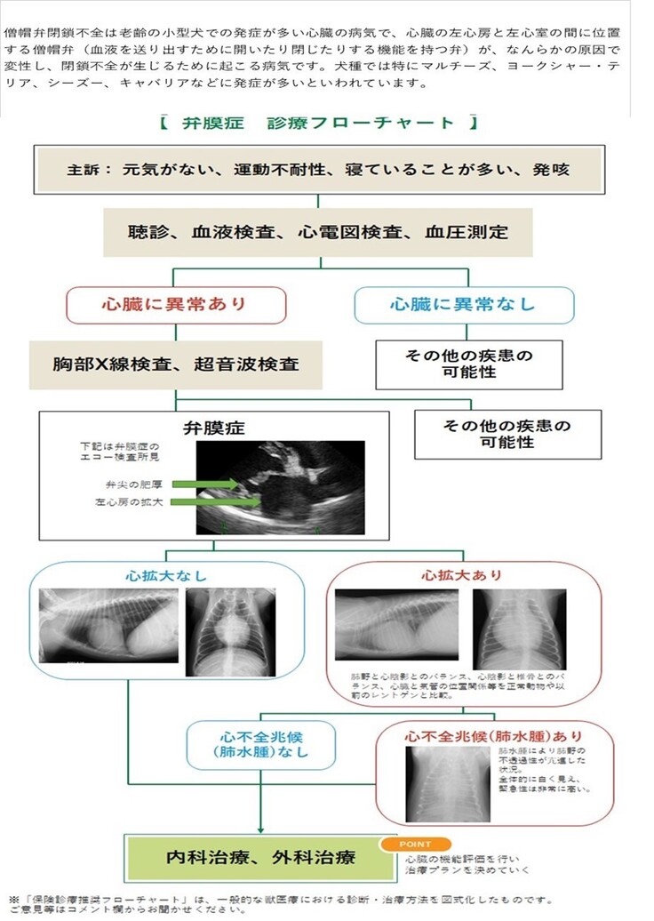 主体となる治療法は、強心薬・利尿剤・気管支拡張薬・血管拡張薬等の服用継続での延命、もしくは外科治療にて変性した僧帽弁の修復を行うことのいずれかです。
