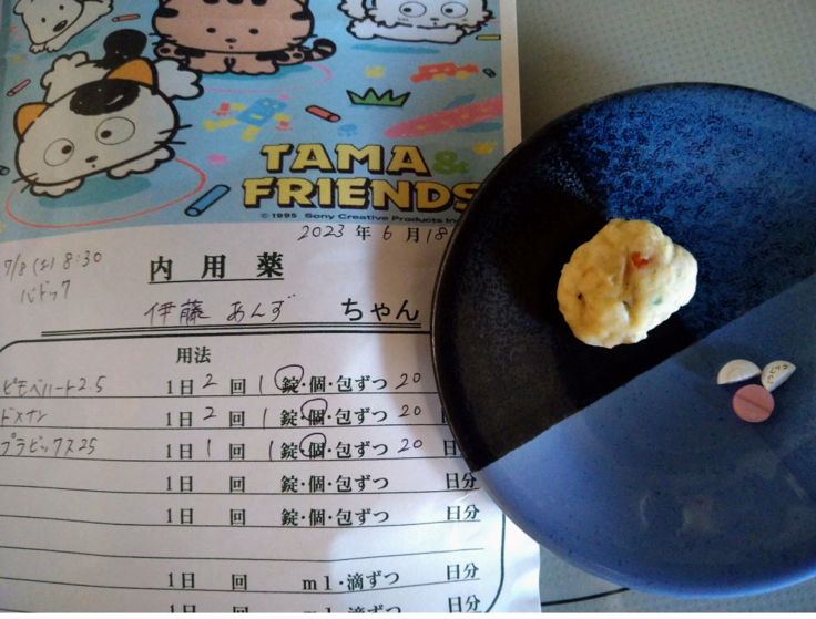 そのひとつがコレ…チキンボール。同じシリーズでウィンナーもありますので交互にお世話になっております。あんずが飽きるまでよろしくお願いします。こうして頑張ってお薬を飲んでいても今日は何だか退潮悪そうで…心臓を取り出して戻してからまだ2週間…と思い焦らずに見守っています。