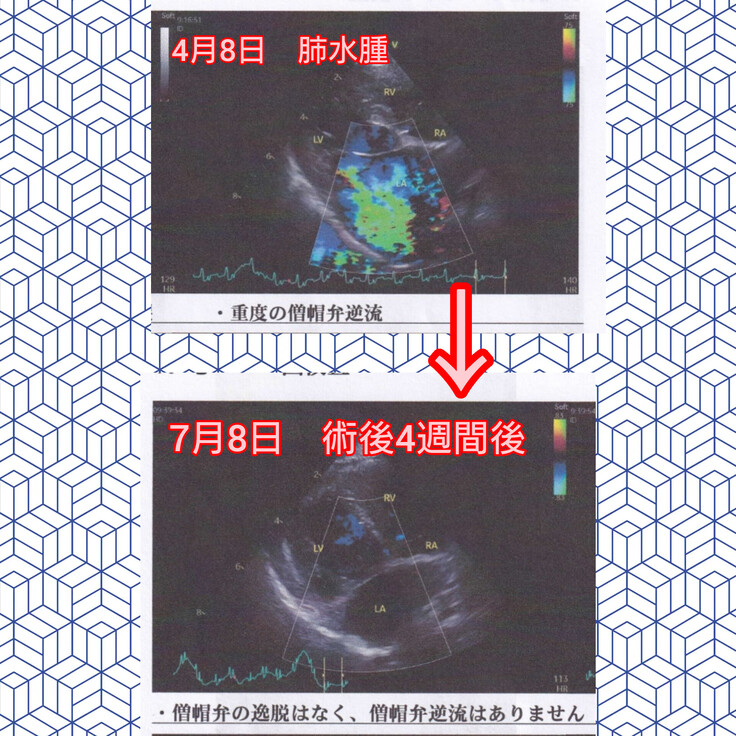 セカンドオピニオンで訪れた日には既に肺水腫を起こしており危険な状態でした。色の付いている箇所は血液が逆流している僧帽弁付近です。全身に回るべき血液の93%が逆流していると想像も出来ないほどの恐ろしい状態でした。