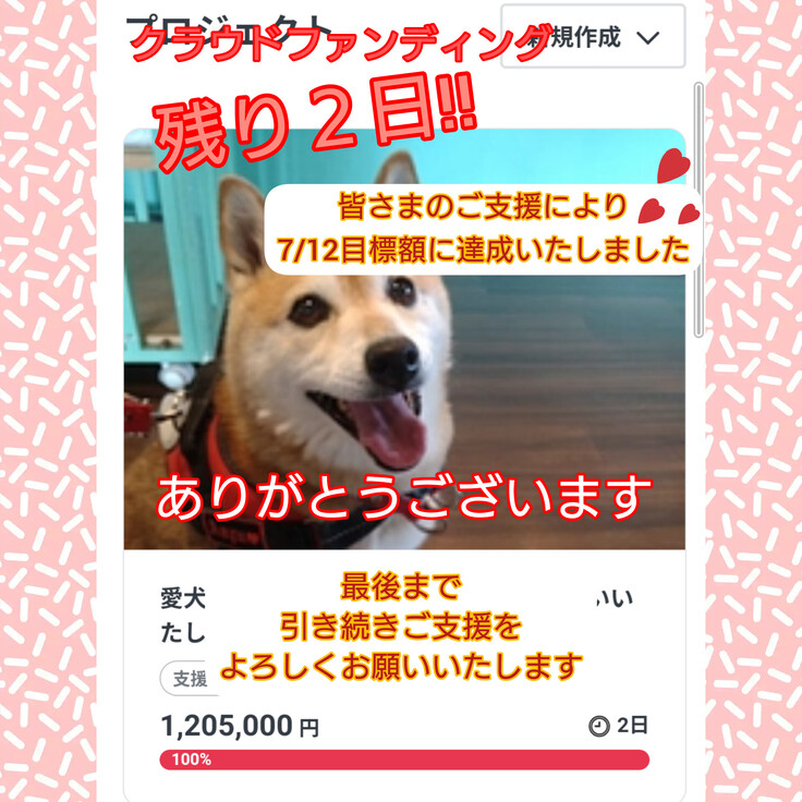 仕事中であったため、夜遅くの確認となりお知らせが遅れましたこと申し訳ございません。多くの方がクラウドファンディング挑戦中の拡散をインスタでしてくださっていたおかげです。そしてあんずのためにご支援くださいました皆さま、本当にありがとうございます。感謝の気持ちをお伝えする言葉も見つかりませんが、ありがとうございました。あんずを思ってくださるお気持ちが形となった事に心よりお礼申し上げます。