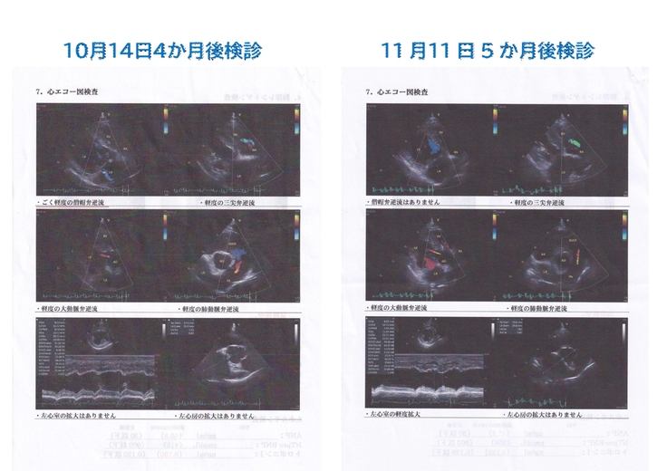 3ヶ月後検診にて僧房弁より血液の逆流が認められておりましたが、10月4ヶ月後検診でも同様に血液の逆流が認められておりました。
