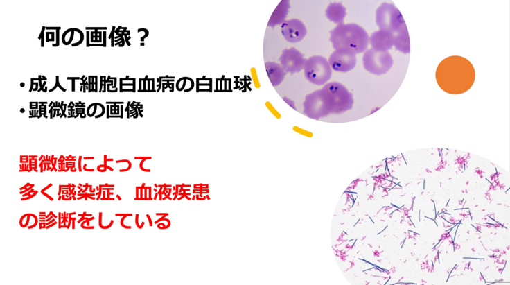 正解は成人T細胞白血病の白血球を顕微鏡で見た画像です。白血球は顕微鏡で見るとこんなにも美しいのです。